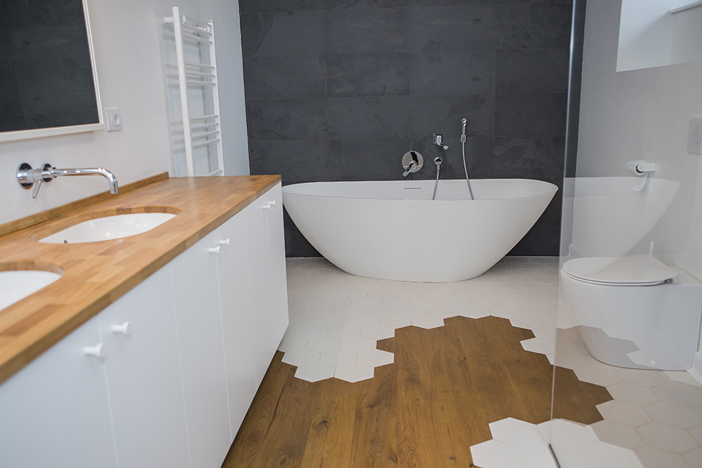 Acest proiect respiră relaxare, inovație, simplitate și creativitate și asta pentru că a fost gândit de partenerii noștri de la 441 Design Studio ca un loc confortabil, cald, definit de stilul de viață “hygge”. Proiectul a fost unul foarte vast, iar la final am avut parte de o transformare radicală. Împreună cu echipa de arhitecți și proprietarii am decis să recompartimentăm complet întreaga suprafață. Am schimbat tâmplăria, instalațiile sanitare și electrice, am îndreptat pereții și am refăcut și lărgit scara interioară. Vila a fost îmbunătățită cu un sistem de racire/încălzire prin pereți și cu cel suplimentar de încălzire prin plintă. Datorită acestui sistem de încălzire prin pereți, pereții de rigips au fost construiți cu cameră de aer și folie de condens. Finalul a fost unul spectaculos iar despre proiect au scris și partenerii noștri de la 441 Design Studio dar și Designist.ro.