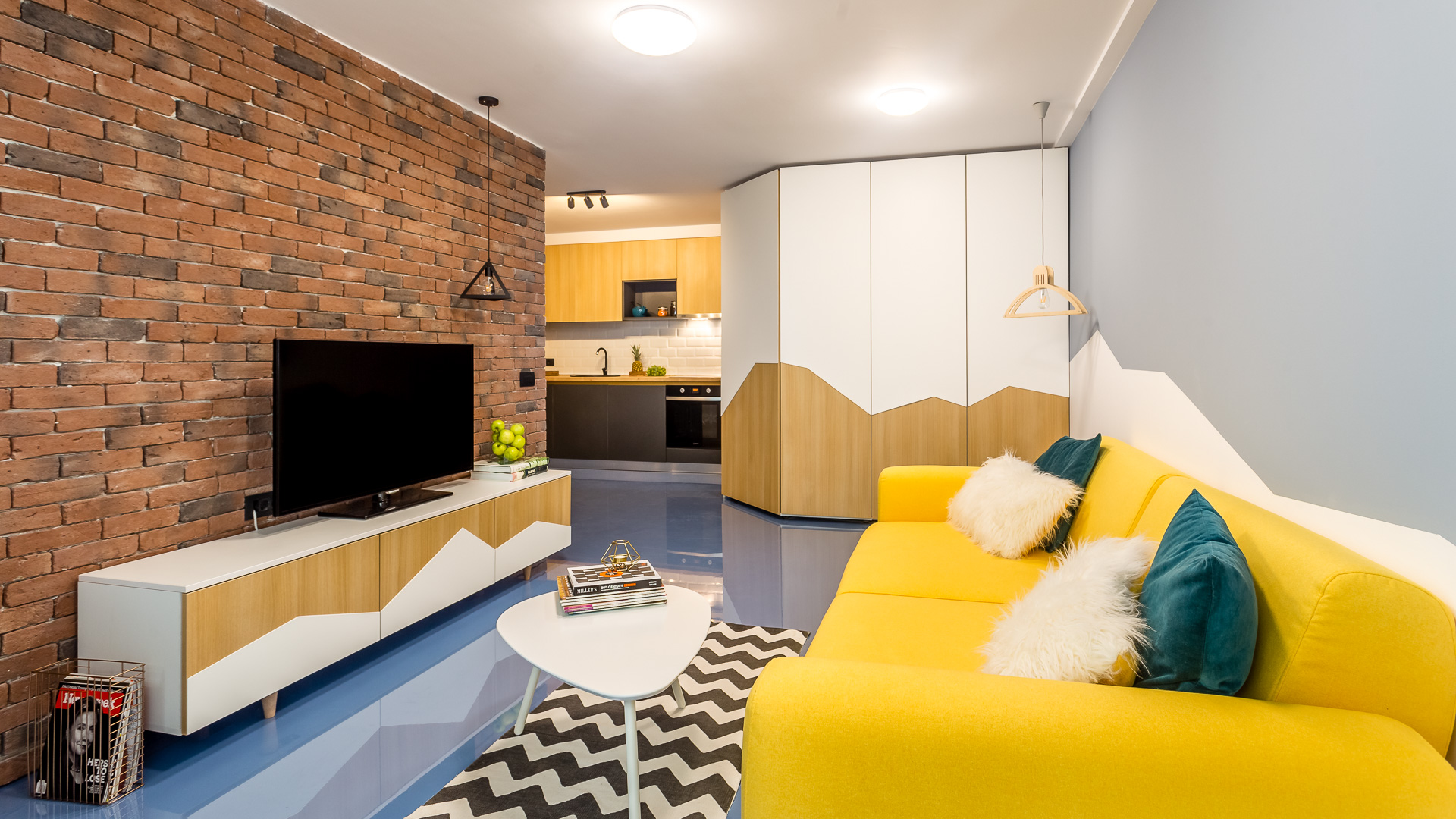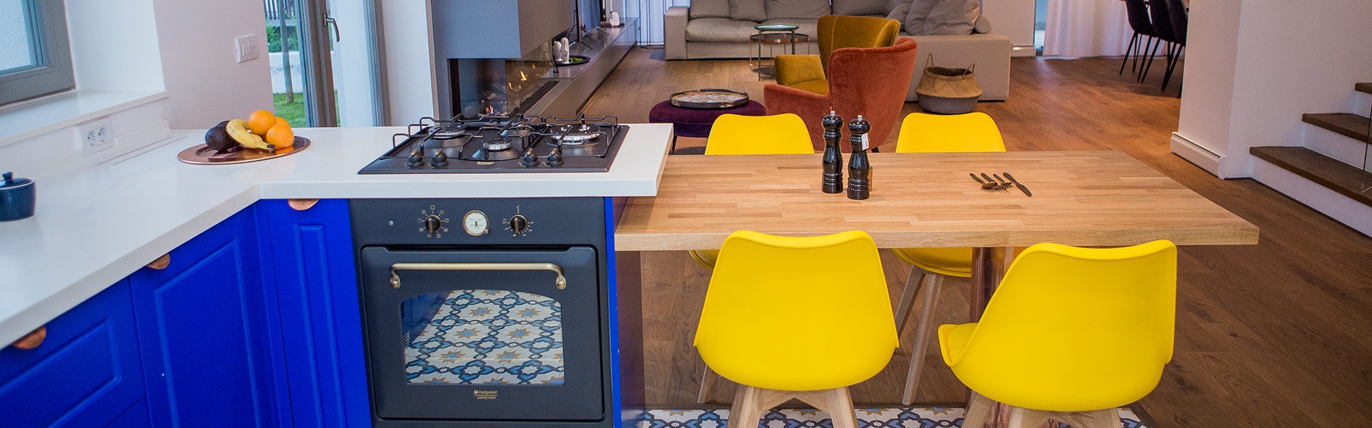 Despre acest apartament spunem de fiecare data că este un proiect maraton. A fost finalizat intr-un timp record, chiar la timp pentru căsătoria proprietarilor. Apartamentul are 67 de metri pătrați (fără balconul transformat, după renovare, în birou) și este format din living și bucătărie open-space, două băi, dormitorul matrimonial și cel de oaspeți. Proprietarii și-au dorit un loc simplu cu multe accente de culoare și spații pentru depozitare. Partenerii noștri de la iDecorate au create conceptul iar noi l-am finalizat cu succes. Accentele de culoare din mobilier sunt completate de nuanțele pereților, alese împreună cu echipa de arhitecți și cu proprietarii.