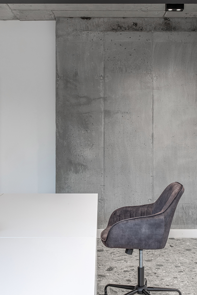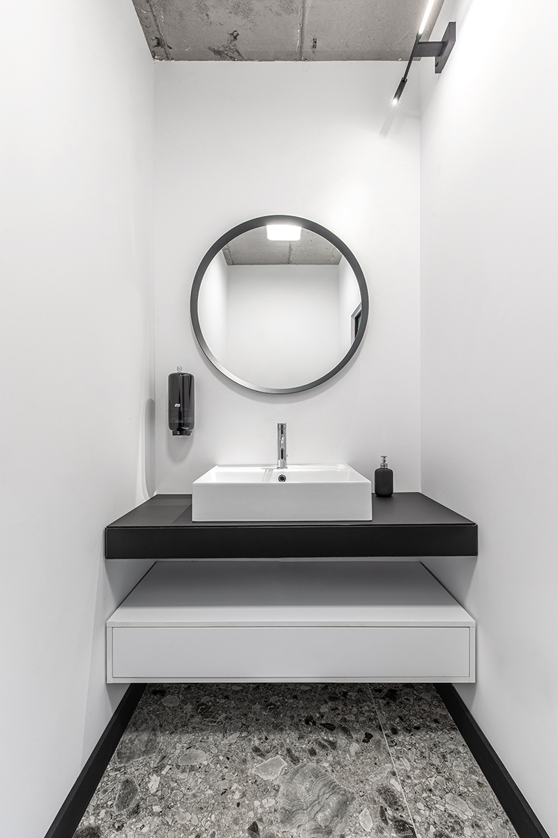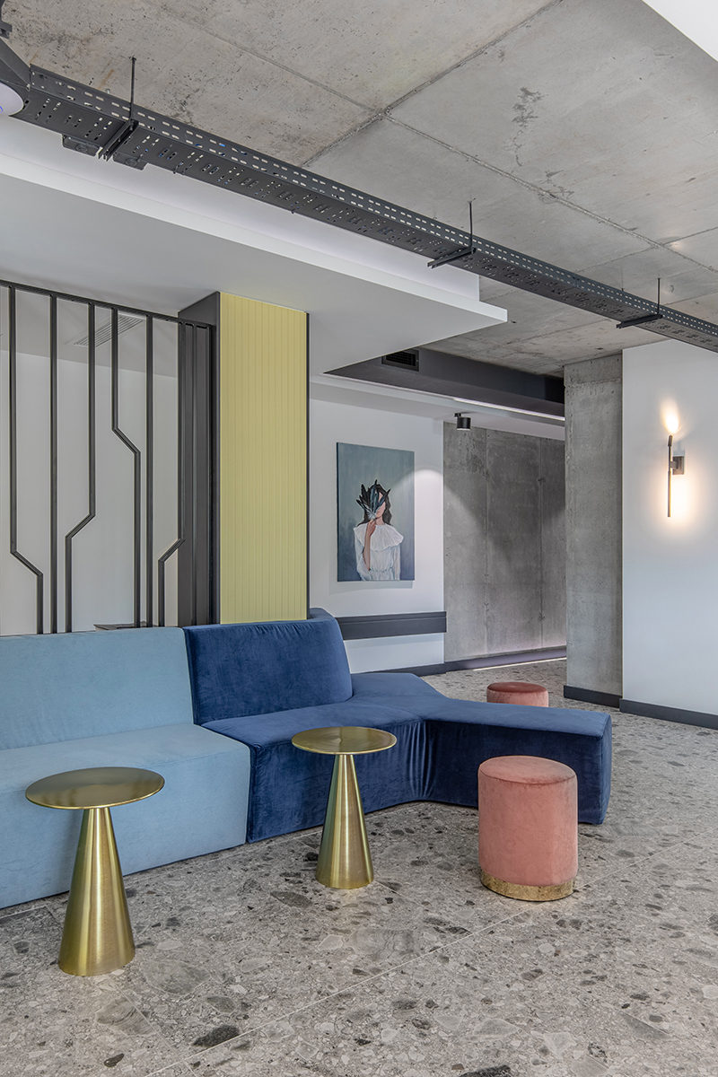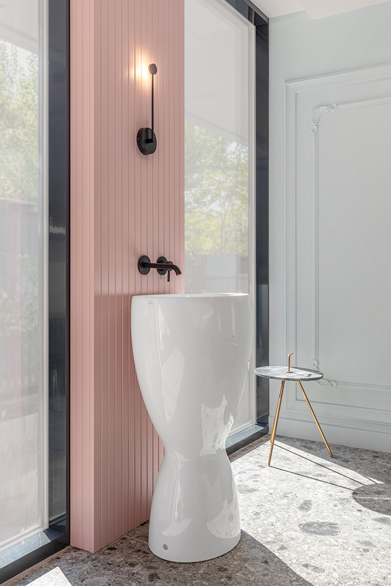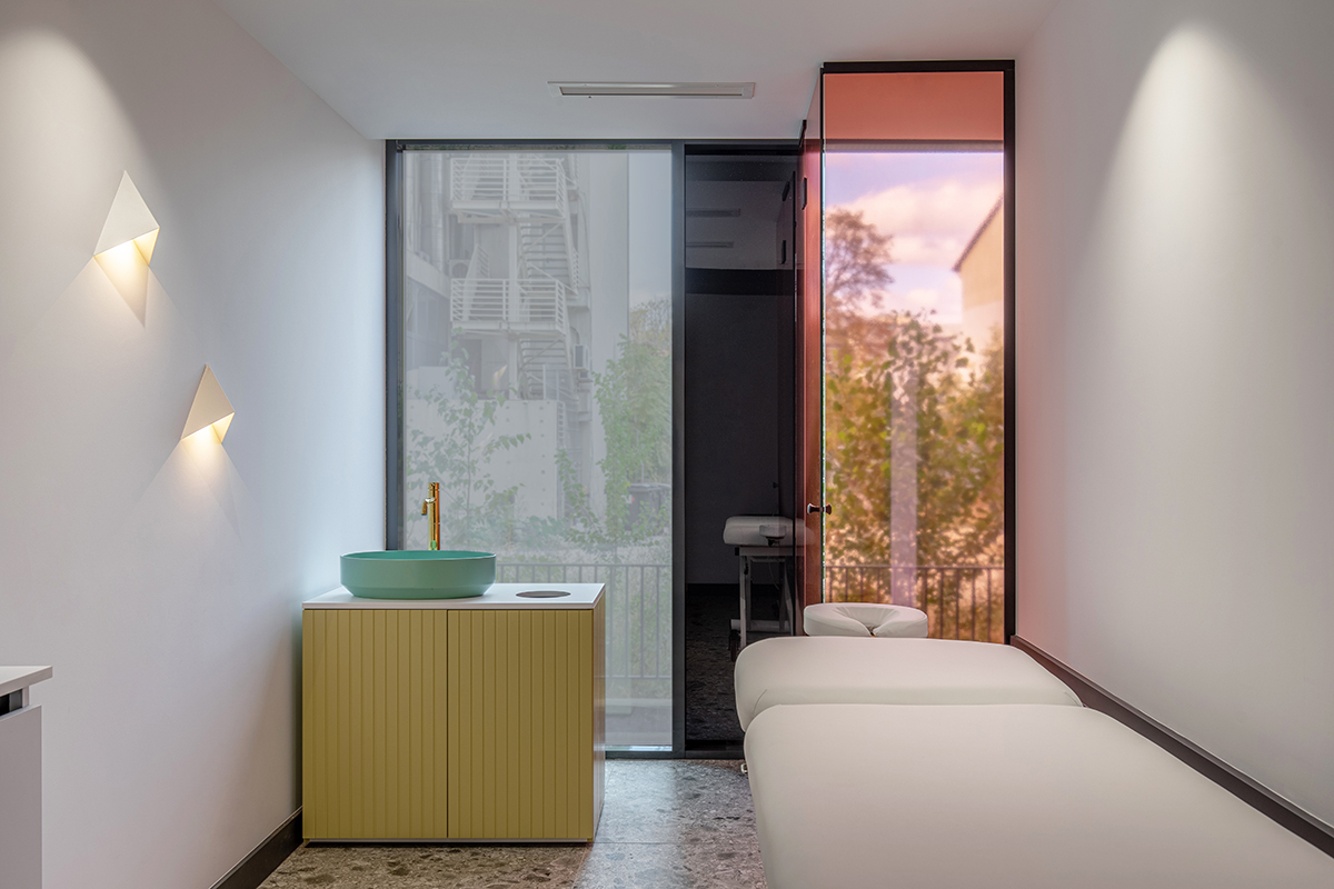 Încă din zona de recepție, elementele de amenajare anunță designul interior îndrăzneț și ultra-personalizat din celelalte spații. Salonul de înfrumusețare folosește finisaje contemporane: terrazzo, beton, alături de inserții de roz pudrat și bleu delicat. Inserțiile metalice și sanitarele freestanding se reiau în baia dedicată clienților.