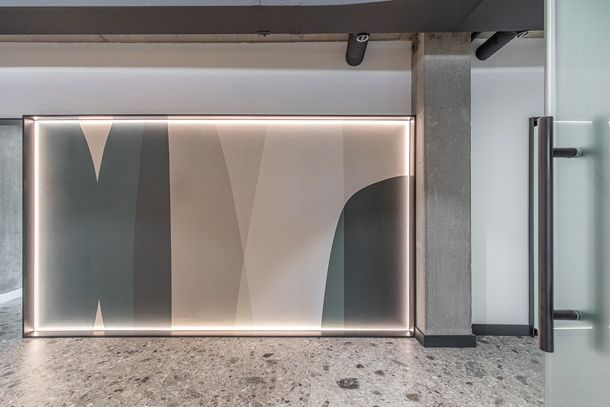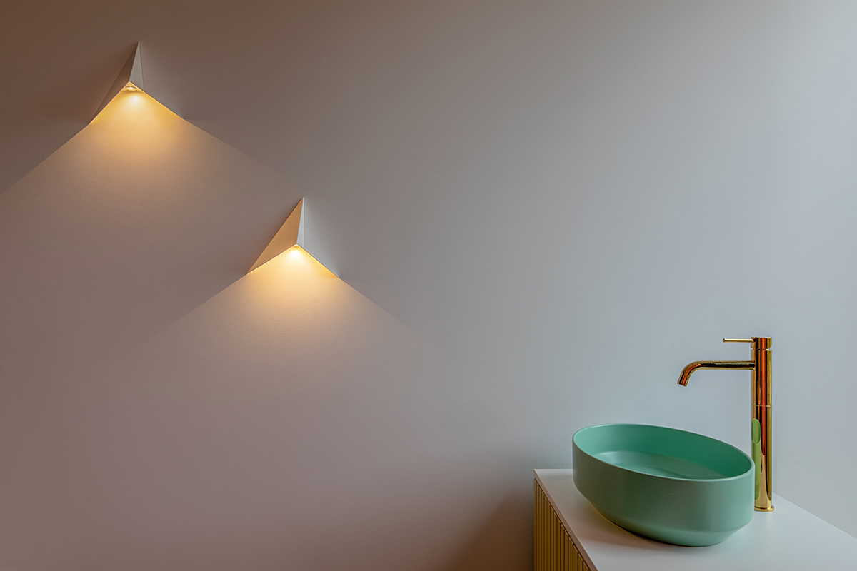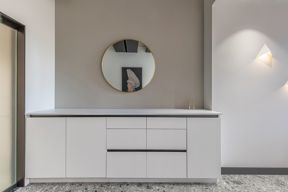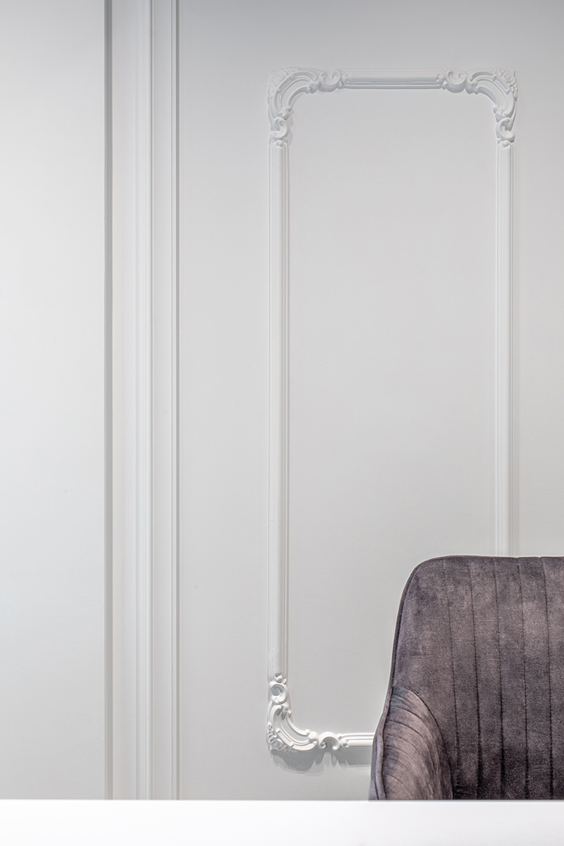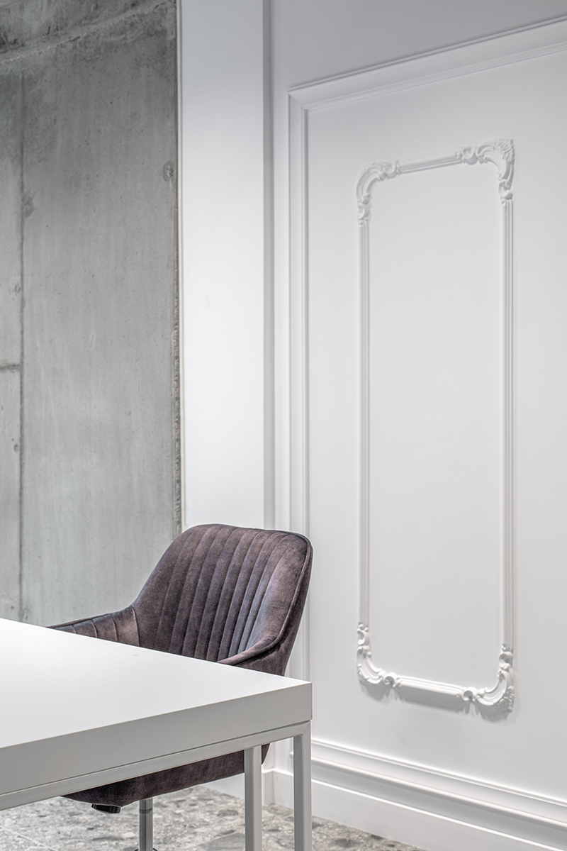 Încă din zona de recepție, elementele de amenajare anunță designul interior îndrăzneț și ultra-personalizat din celelalte spații. Salonul de înfrumusețare folosește finisaje contemporane: terrazzo, beton, alături de inserții de roz pudrat și bleu delicat. Inserțiile metalice și sanitarele freestanding se reiau în baia dedicată clienților.