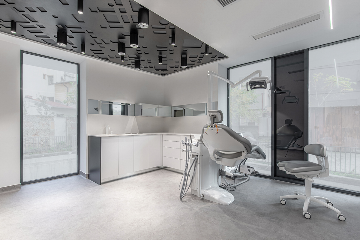 Cele patru cabinete dentare se diferențiază prin nuanțele folosite pentru tavanul traforat: verde, roșu, galben și negru. Zona de dermatologie propune ambiente senzoriale.
